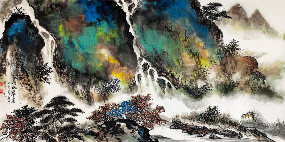 梁画家,在山水画上,作大胆尝试,用拔墨拔彩的技法,去表现抽象的意境对象,创造出色墨形态之美,从而达到视觉的冲激效果。反有张大干大师的传承之笔。而在形象的具体表现,又不失传统的《骨法用笔》,画中线条苍劲有力丶值得回味,在《黎家山水》方面的涉猎,都能体现。